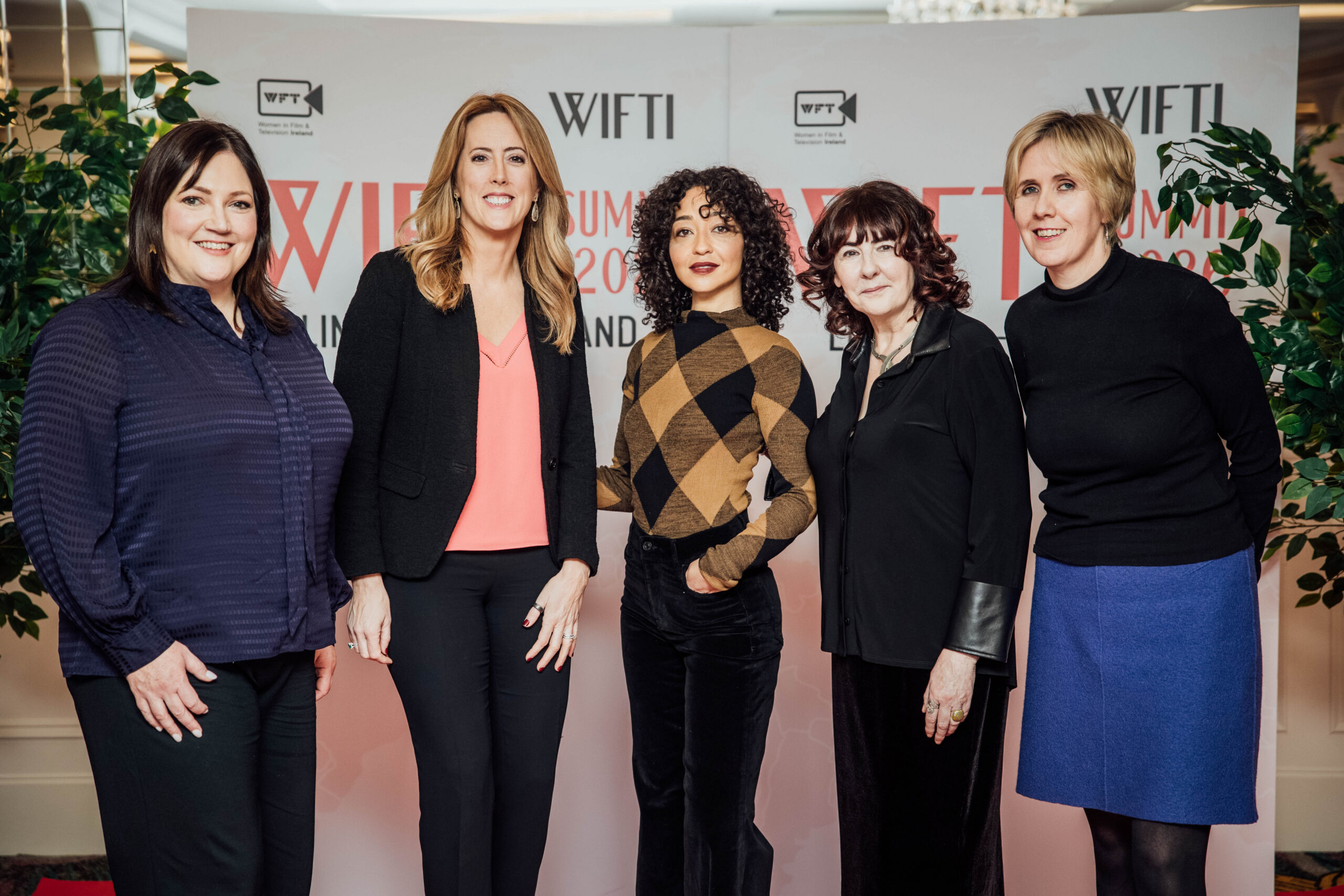 From left to right Deirdre Ní Choistín, Director General, TG4; Désirée Finnegan, Chief Executive, Fís Éireann/Screen Ireland; Ruth Negga, BAFTA, Emmy, and Oscar-Nominated Actor (Passing, Presumed Innocent); Dr. Susan Liddy, President of WIFTI & Chair of WFT Ireland; Elizabeth Farrelly, Assistant Director, Media Development, Coimisiún na Meán (Irish Media Commission). (Photo by Brian Arthur)