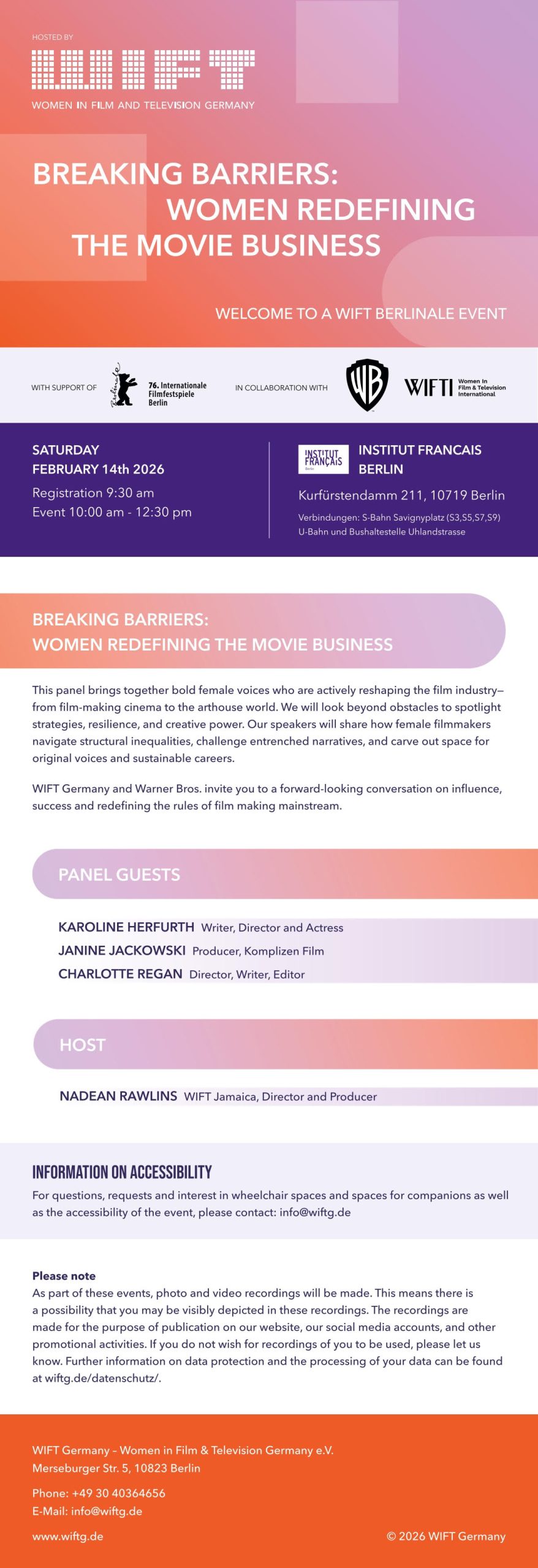We are thrilled to share that our wonderful German Chapter will be hosting an exciting event at Berlinale 2026! Spots are limited but it’s not too late to get your name on the waitlist. You can secure your spot HERE. See below for more details: